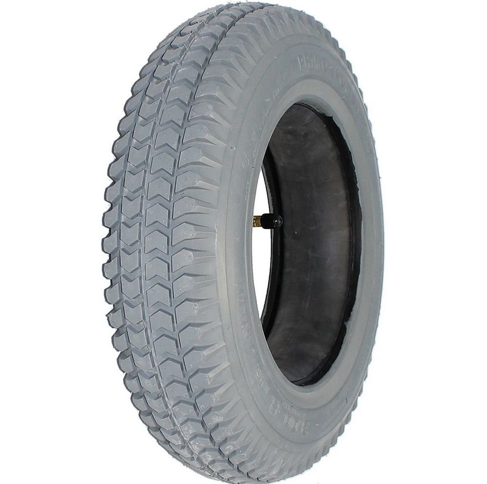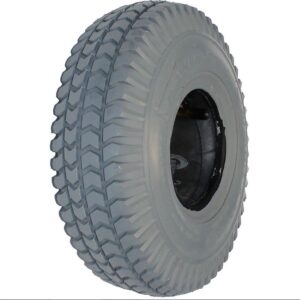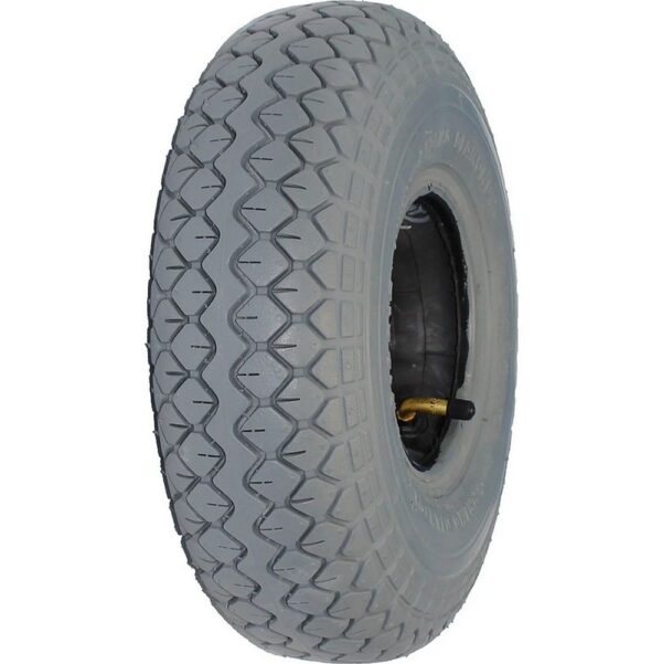 Elektromos rokkantkocsi gumiabroncs, belsővel együtt. A tömlő hajlított fém szeleppel szerelt, könnyen hozzáférhető.